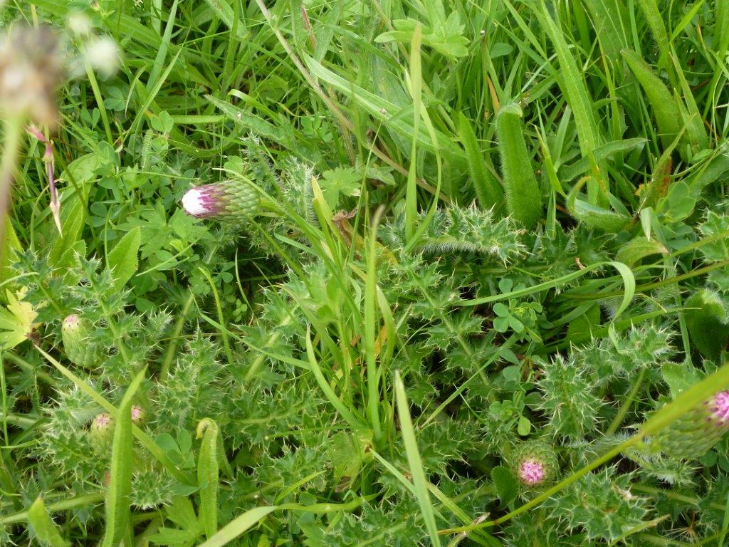 This field provided a highlight with the discovery of dwarf thistle Cirsium acuale, a typical plant of calcareous grasslands in southern Britain but uncommon in Gloucestershire west of the Severn. Several other non-meadow species were added to the species list here and at the churchyard