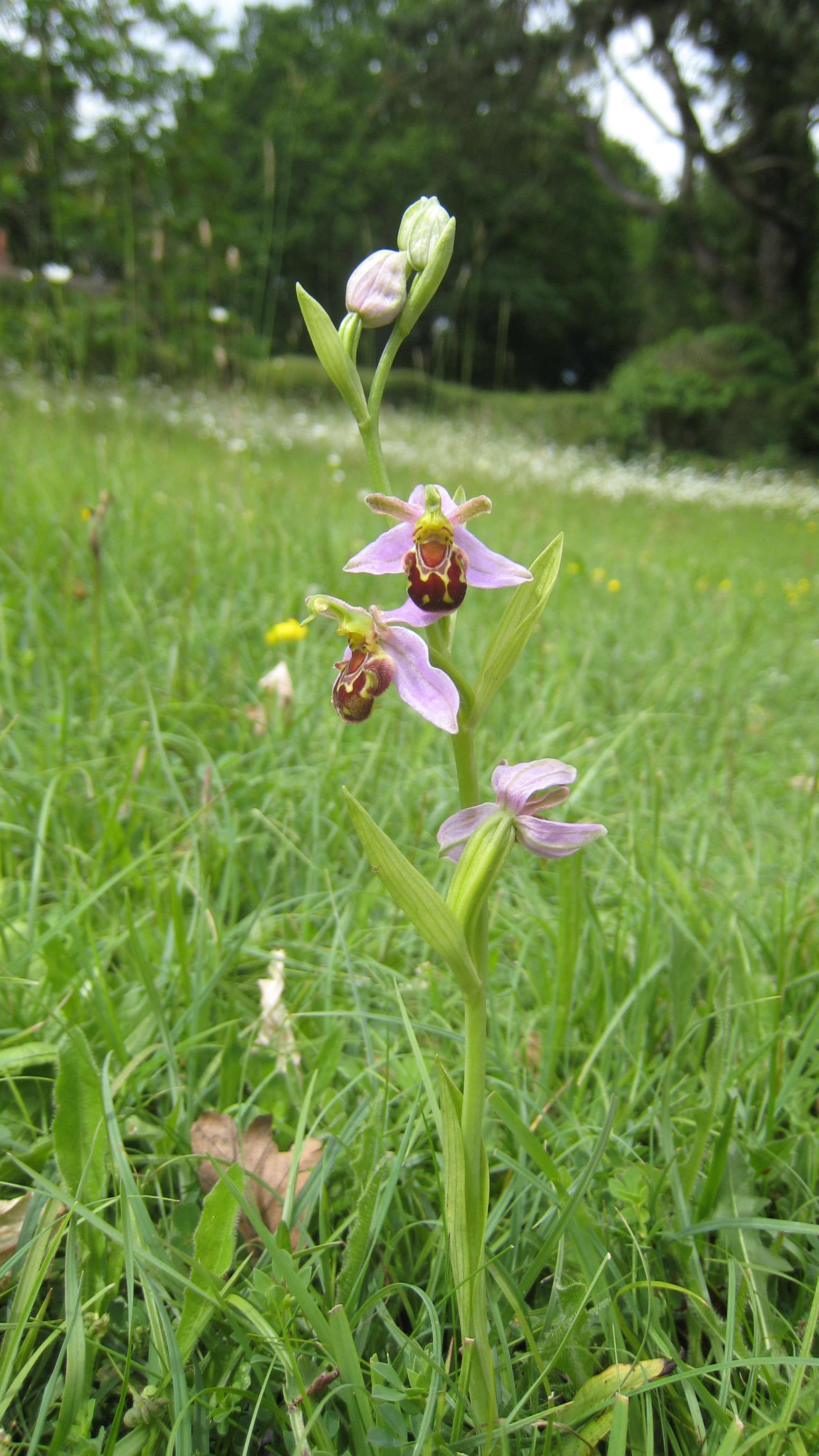 Area A. A small area of dry calcareous grassland running along the drive with a hedge on the north side. This is a very attractive patch of dry grassland where several Bee orchids have appeared in 2012 for the first time. In May there were at least 50 Green winged orchids here and later each year there are Autumn Ladies Tresses.